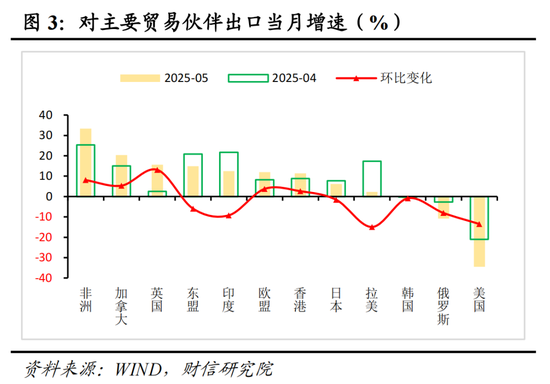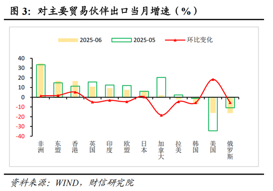 分国度和地区看,受中好意思经贸会道推崇积极影响,6月份我国对好意思国出口同比下落16.1%,降幅较上月收窄了18.4个百分点(见图3),孝顺了出口增速回升幅度的超九成,是本月出口增速回升的主要孝顺之一。此外,6月份我国对东盟、香港等主要转口商业伙伴以及非洲等一带沿途国度出口增速分歧为16.8%、16.7%、34.8%,赓续录得较高增长,是我国出口韧性的热切赞成。