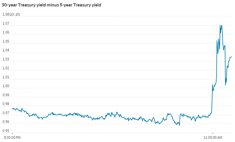 受此影响,好意思债收益率弧线在周一盘中赶紧趋陡——30年期债券收益率与5年期债券收益率之间的差距一度达到103个基点,高于鲍威尔可能被辞退的首份报说念之前的97个基点。