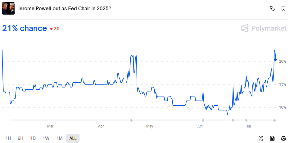 周三Polymarket平台的押注炫耀,往复员瞻望特朗普本年辞退鲍威尔的可能性一度达到约24%,这是自客岁年底创建该押注以来的最高概率。
